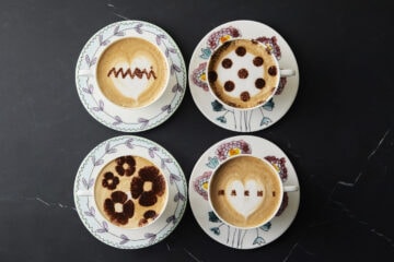 ドリンクメニューはマルニのDNAであるフラワーやドット、ロゴが表現されたカプチーノのほか、フレーバーティーやアルコールなど。マルニ カプチーノ 各¥1,650