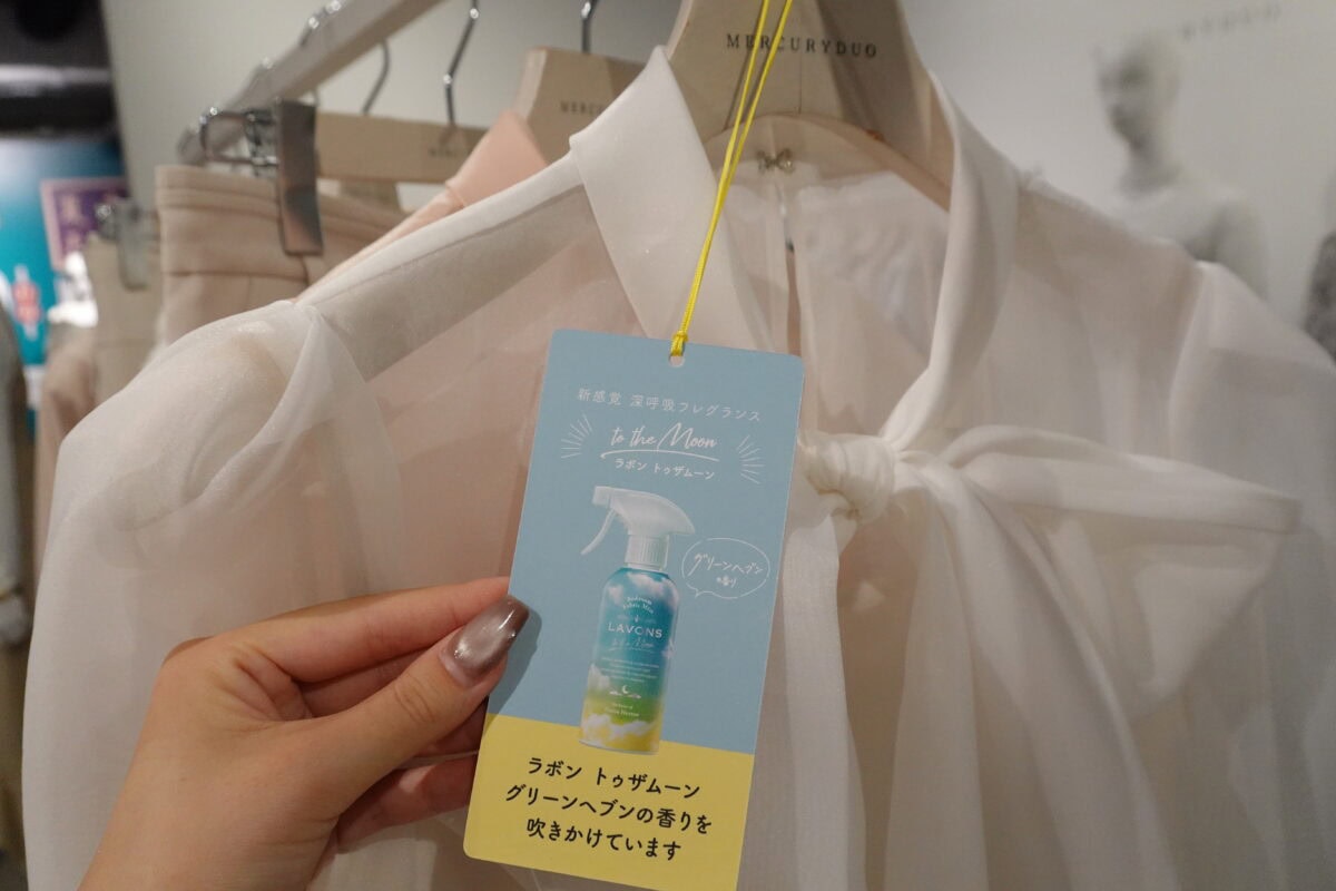 ラボン トゥザムーンのベッドルーム&ファブリックミストを吹きかけた新作アイテムはタグが目印。アイテムを手に取るたびに心地よい香りがふんわり広がりました。