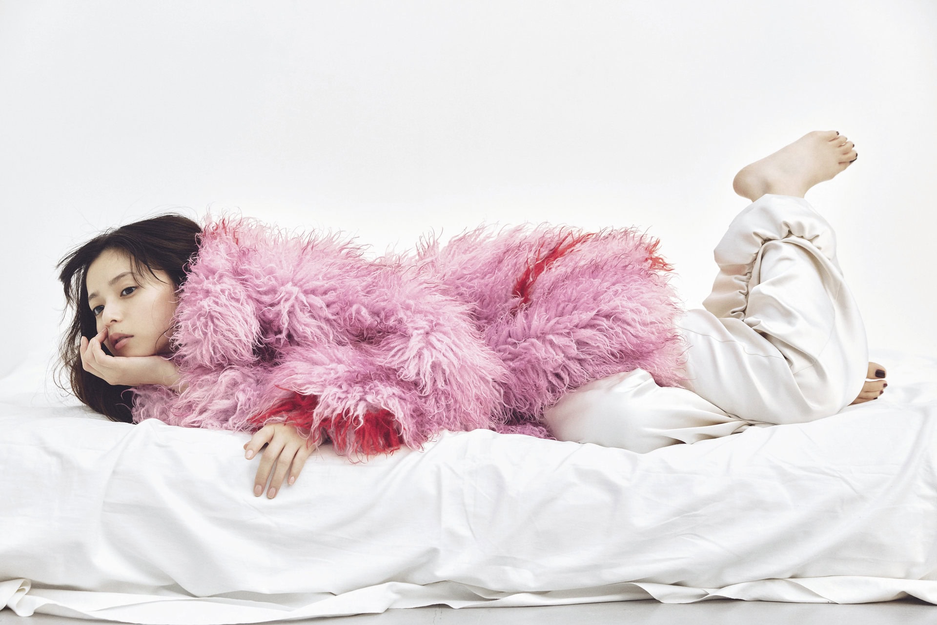 ピンクの色みが甘い分、シャギーファーでレディと少女の間へ 。ピリッときかせた赤とニュートラルな艶めくフリル パンツの、コントラストも視線を奪う。