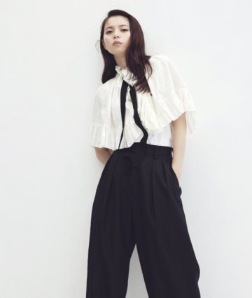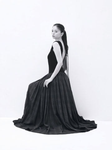 大きく背中のあいたドレスに、清楚なリボンを垂らすというギミックが様々な感情を掻き立てる。あどけなくヘルシー、それでいてストイック。たっぷりと広がるチェックスカートで、静かなる華やぎを。
