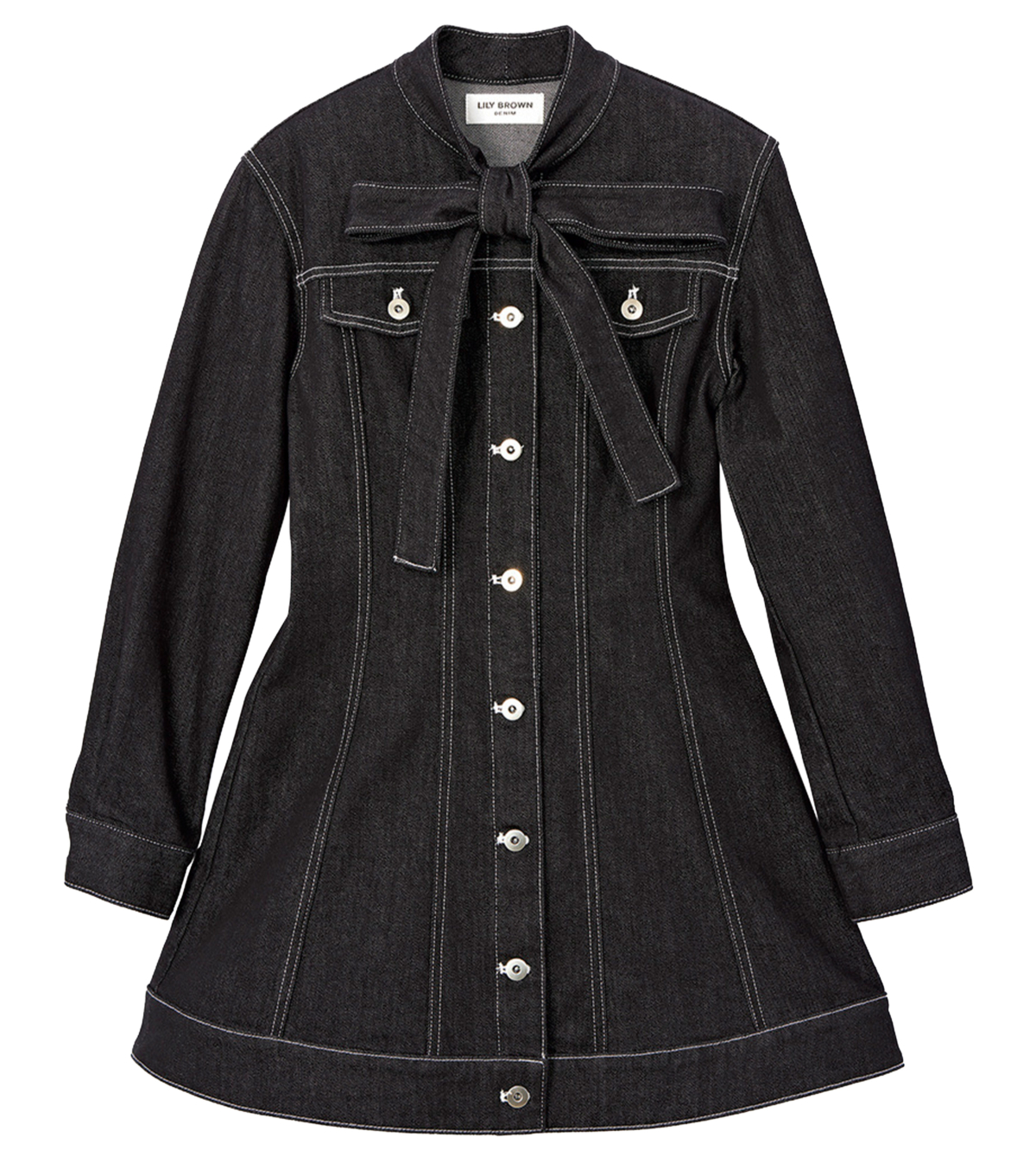 デニムの程よいラフさとリボンの愛らしさが絶妙。ドレス¥16,900(LILY BROWN/LILY BRO WN ルミネエスト新宿店)