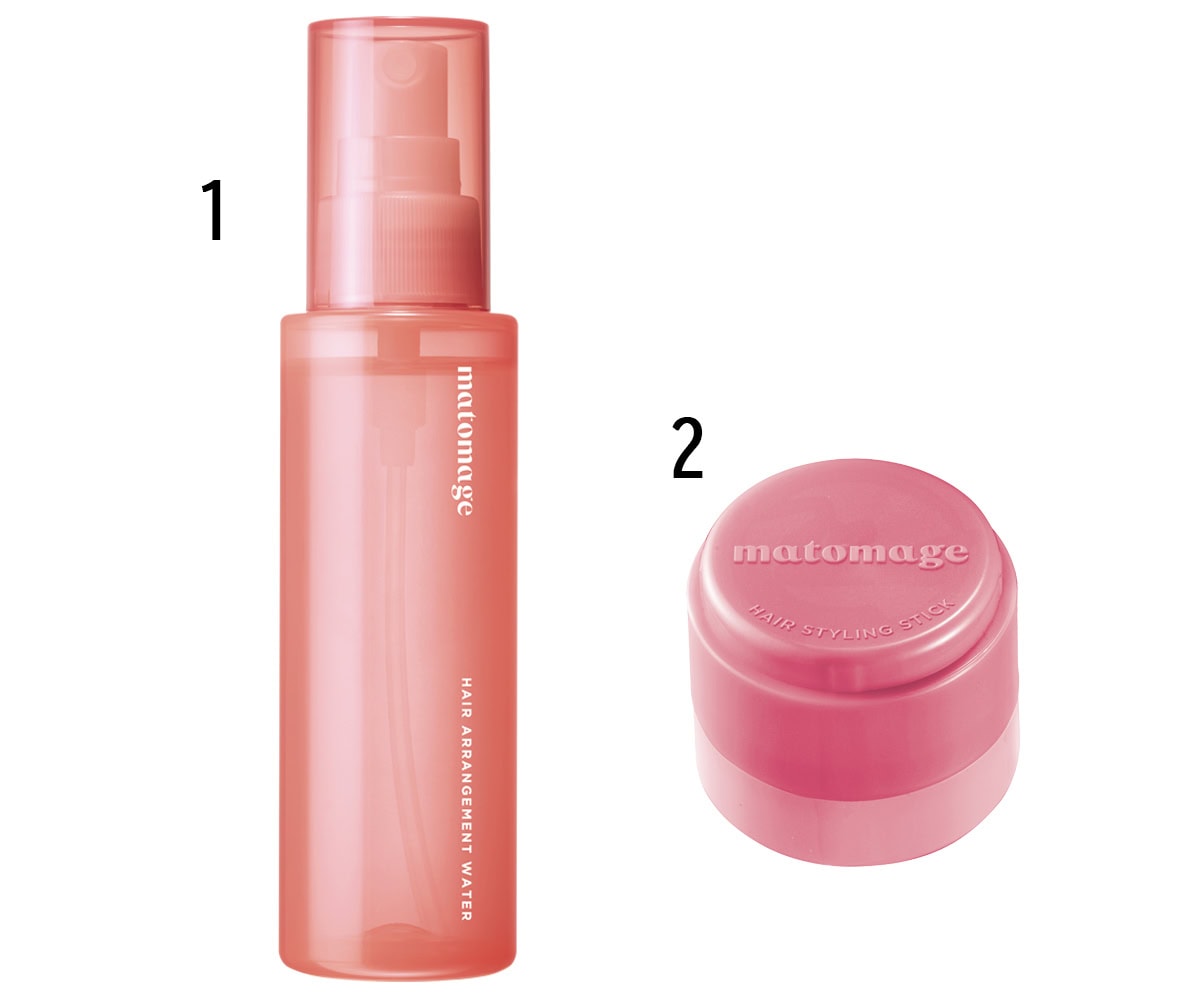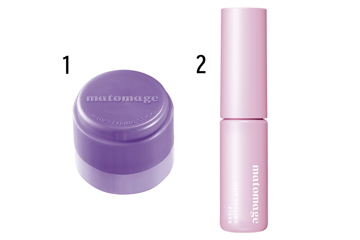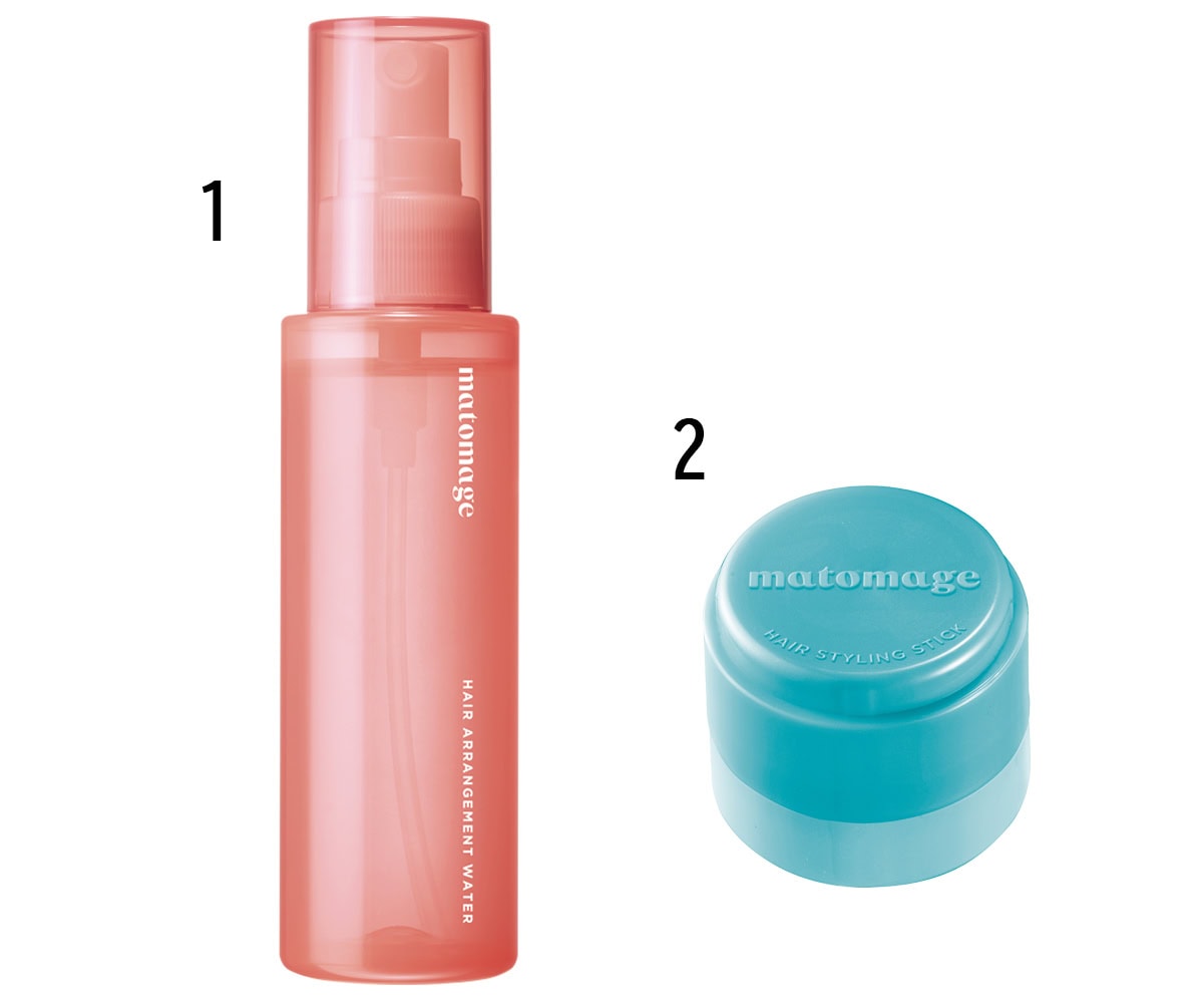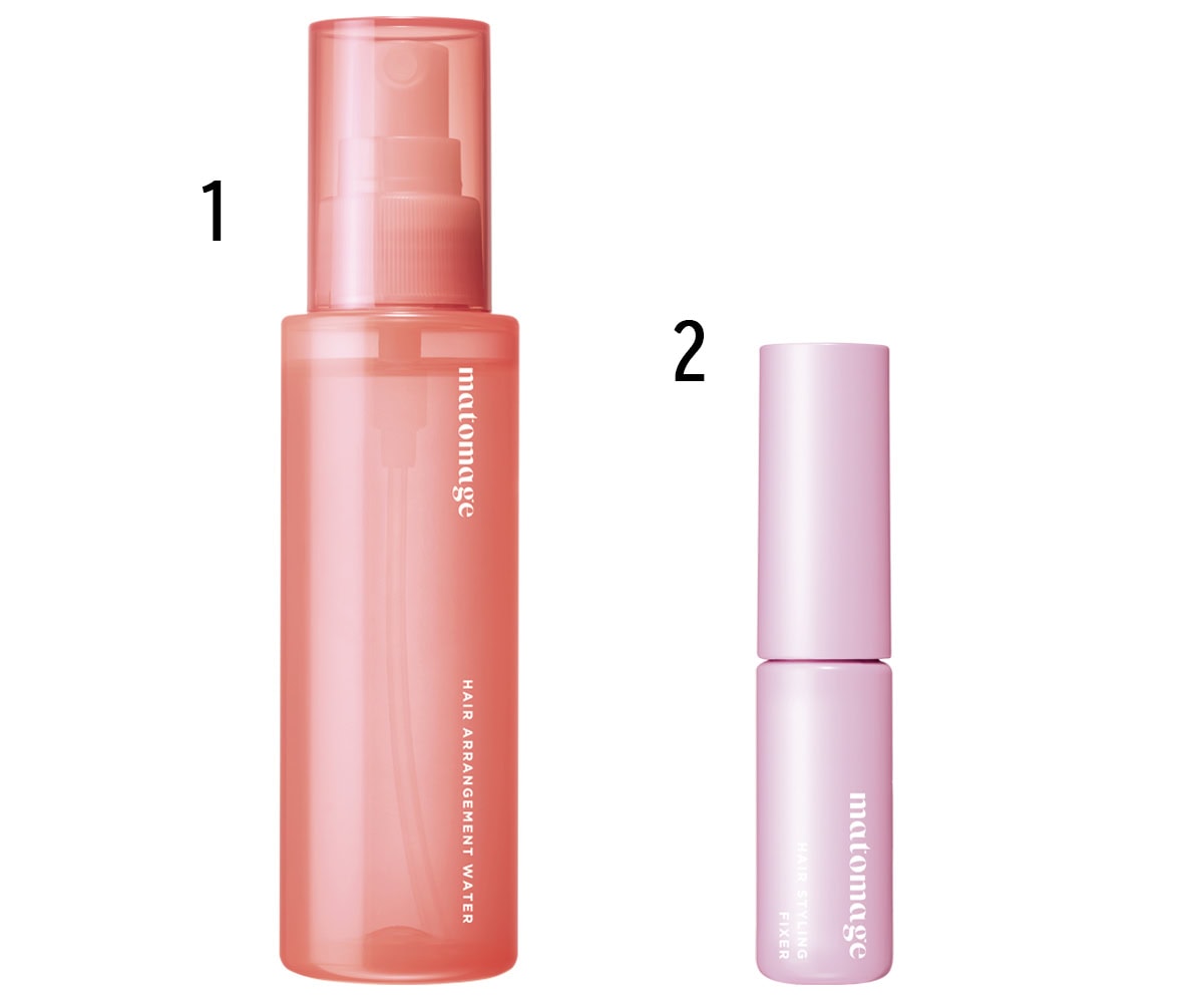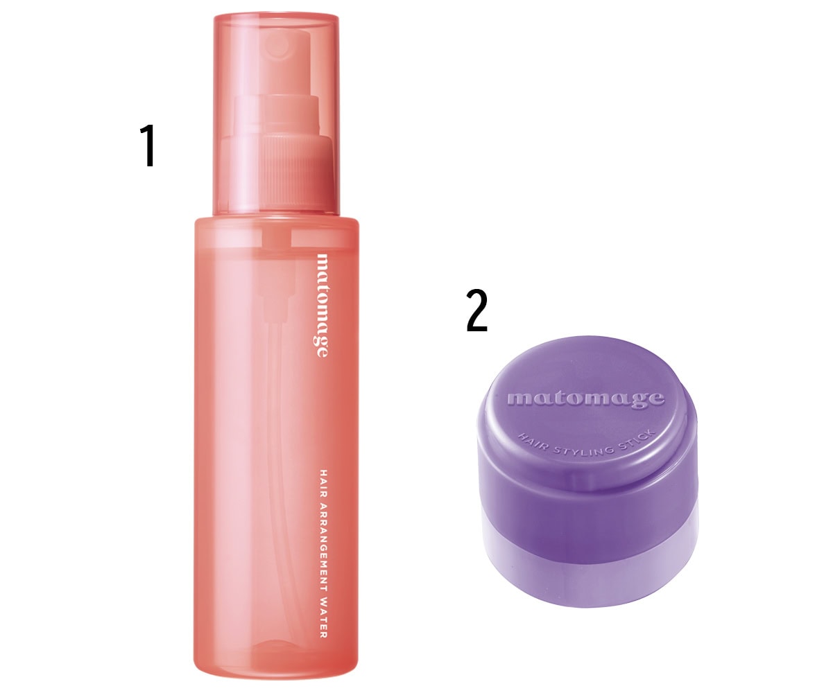 根元から毛先まで髪全体に1をスプレーし、乾いてからコテで波巻きに。ナチュラルなホールド力の2を前髪の内側や毛先につけ、摘んだり揉み込んで束感を出す。揉むことで自然なニュアンスに。