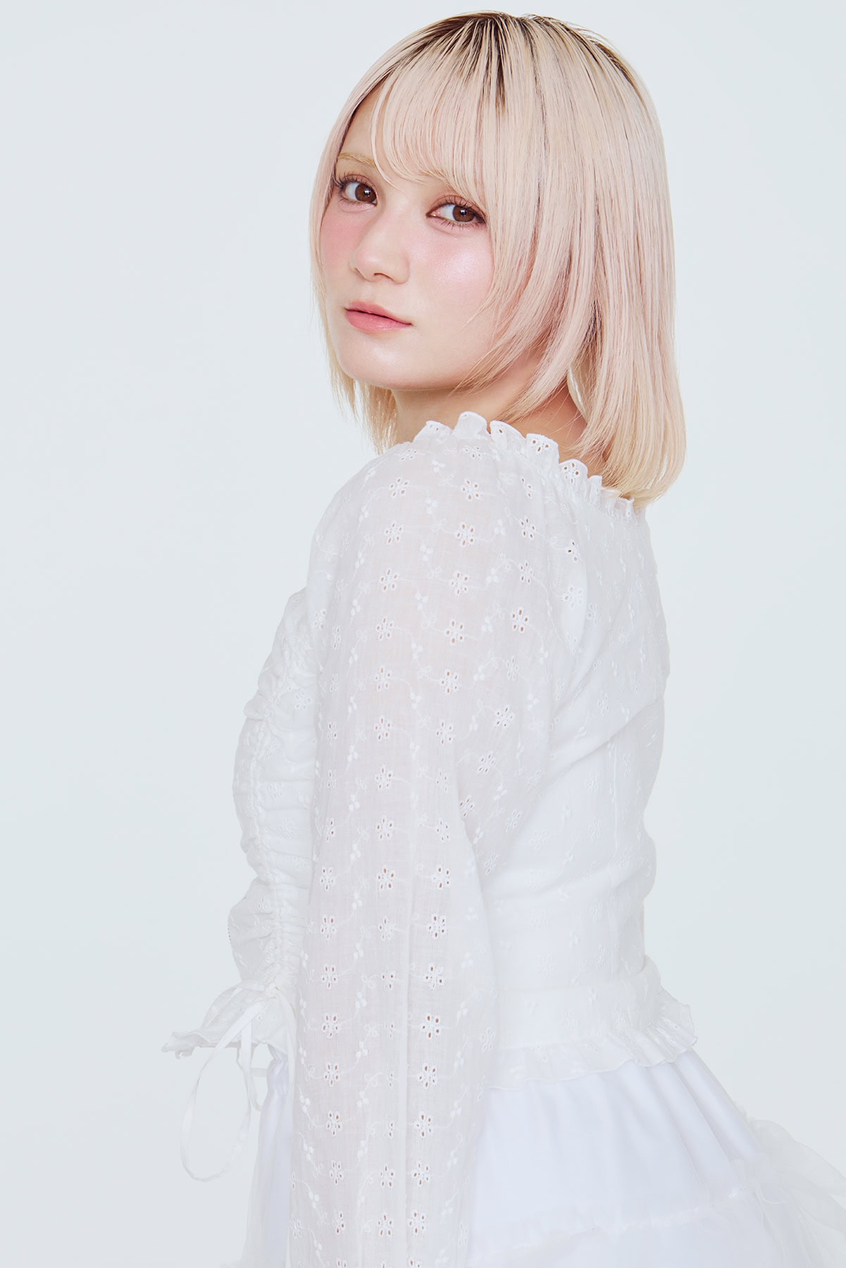 ナチュラルな仕上がりの1を髪全体に軽くつけ、ハイトーンヘアの広がりをおさえる。2で前髪の真ん中と、サイドのレイヤーをとめる。2のグルーは綺麗に作ったヘアを、しっかりキープするのに便利。