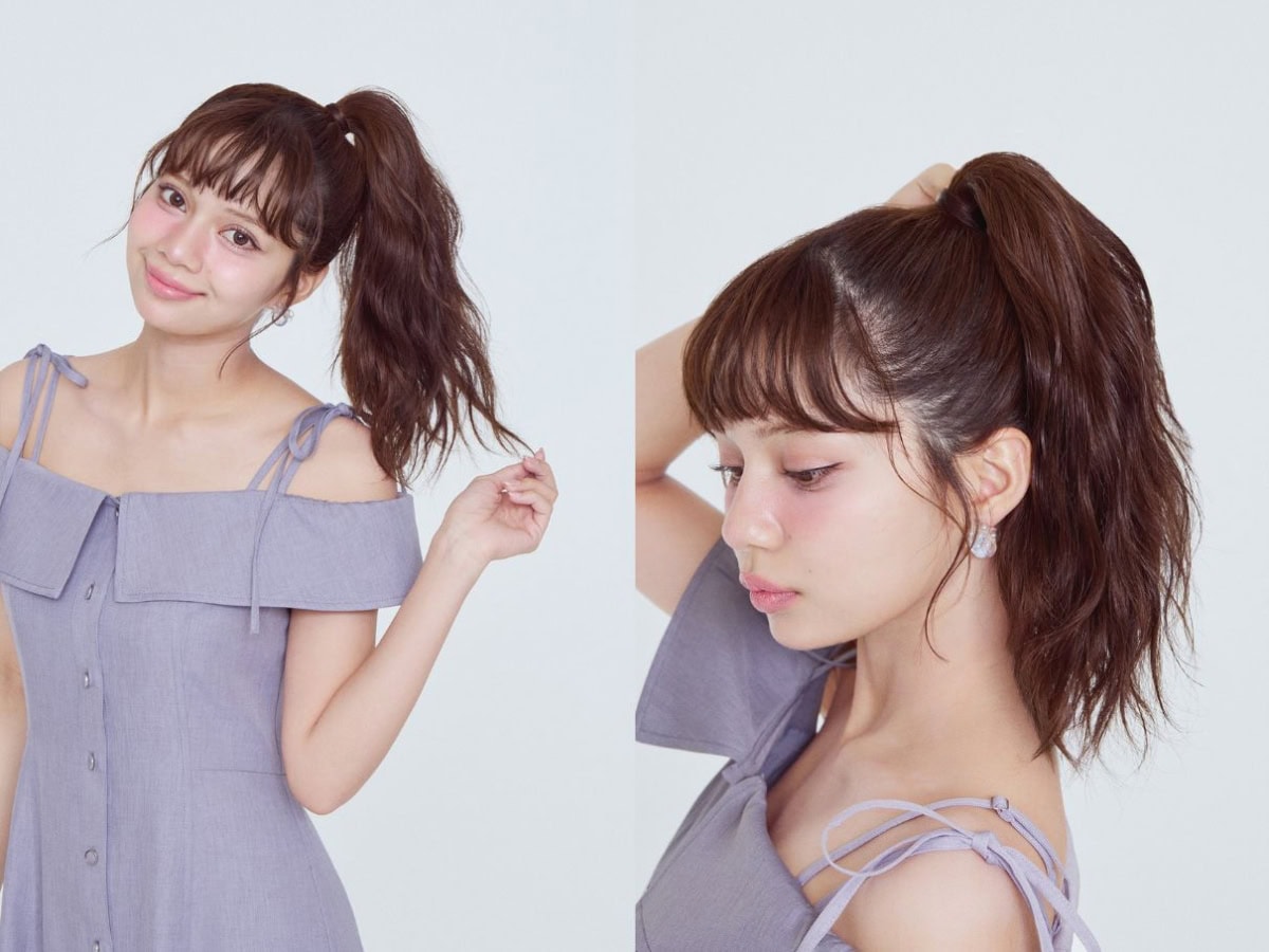 1をスプレーしたらコテで髪を巻き、高めのポニーテールに。髪が浮かないように、2を塗りキュッとタイトにすることで今っぽいフレッシュ感が。おくれ毛がパサつかないよう2で自然な束感を。
