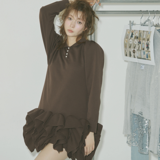 裾にたっぷりとあしらわれた立体感のある構築的なシルエットのフリル。春こそ着たいミニ丈の主役級ニットワンピースを1枚で纏って、大人の甘さを引き立てて。