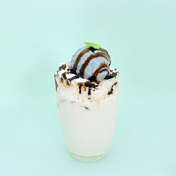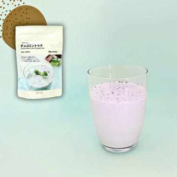 最後に、チョコミント好きにはたまらない、至福のアレンジをご紹介します。つくり方は簡単! 「チョコミントラテ」の上にホイップクリーム、チョコミント クール味の「素材を生かしたアイス」、チョコソース、お好みでミントを添えれば、まるでカフェのような特別感たっぷりのドリンクが完成。クリーミーで濃厚な味わいをぜひ堪能してみてね。