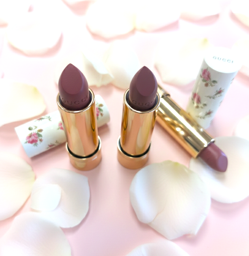 GUCCI Beautyの新作チークとリップをローズペタルの上に並べたビジュアル。バレンタインムードのご褒美コスメ